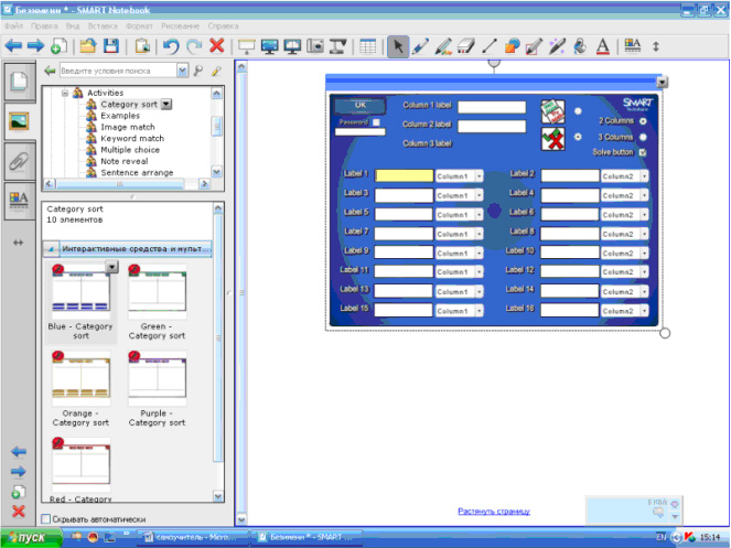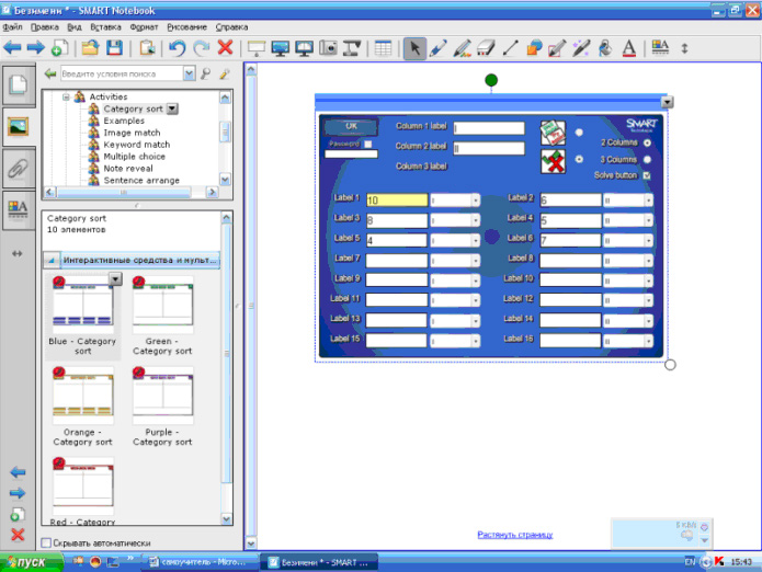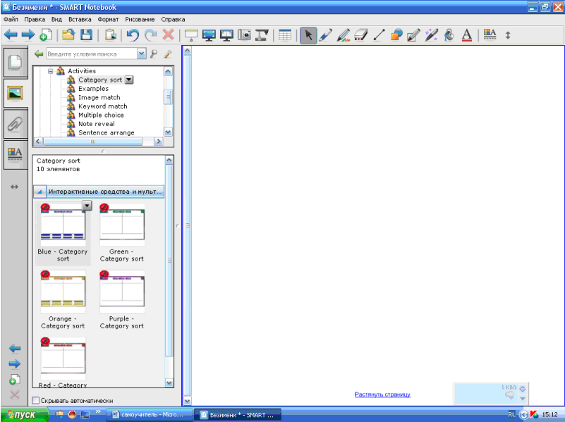 Мы видим, что к нашим услугам 5 цветовых вариантов интерактивного средства Category sort. Выберем цвет, соответствующий общему дизайну готовящегося для урока материала и переместим объект мышкой на страницу. Увидим следующее: