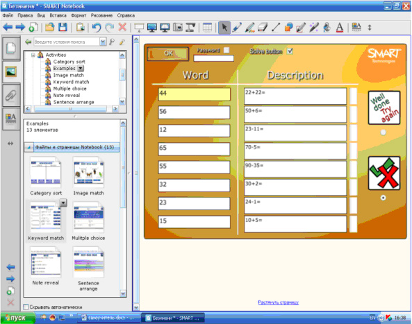 С этим интерактивным средством не все так хорошо, как хотелось бы. К сожалению, при редактировании мы не можем использовать буквы русского алфавита, т.к. русская кодировка символов в данном случае не используется. Давайте попробуем приспособить это средство, например, для проверки знаний счета в пределах сотни. При редактировании в колонку Description (Определения) впечатаем числовые примеры, а в соответствующие строки колонки Word (Слова) - ответы к ним: