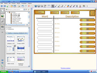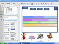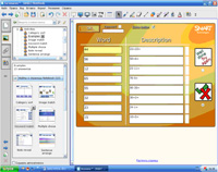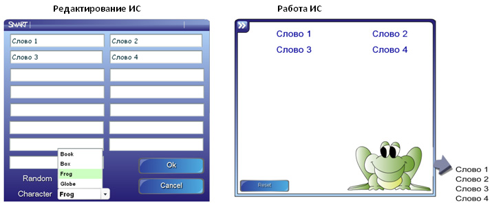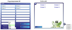Очень интересное ИС, с богатыми возможностями для применения. Мы имеем дело с пустым полем прямоугольной формы, в правом нижнем углу которого имеется какая-то картинка (это может быть изображение лягушки, глобуса, ящика со словами или книги). Эти картинки интерактивны, т.е. при щелчке по ним что-то происходит, например, книга и ящик приоткрываются, лягушка квакает, открывая рот, глобус мерцает. Сами по себе эти действия малоинтересны, гораздо интереснее то, что при каждом таком нажатии на поле появляются какие-то слова или кусочки текста, которые размещаются в две колонки. При нажатии на стрелку список этих слов можно "вынести" из поля в виде отдельного объекта. В процессе редактирования, как раз и задается список слов, их размещение по колонкам, порядок появления (случайным образом или в строгом порядке) и сама картинка, по которой нужно щелкать.