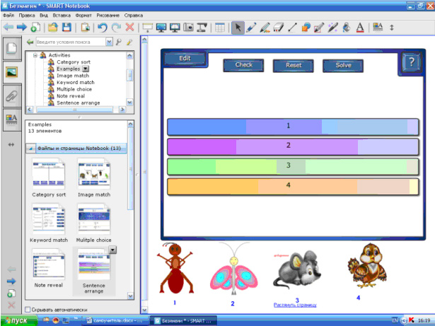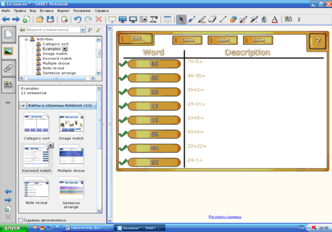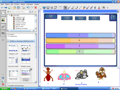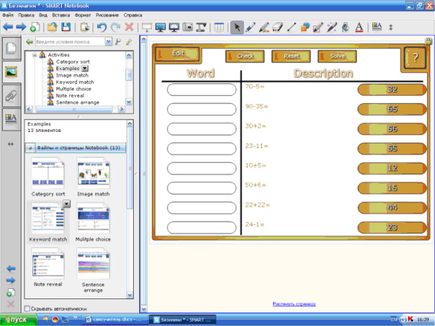 Переходим к работе с ИС. Рис.1 - начальная "диспозиция". Клавиша Check (Проверка) позволяет проверить правильность выполнения задания, клавиша Solve - "подсмотреть" ответ, клавиша Reset - вернуться к началу. На Рис. 2 - итог выполнения задания.