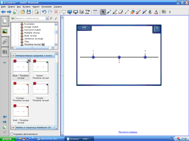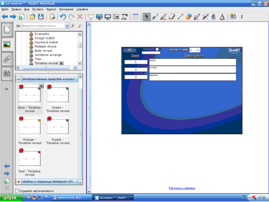 Это ИС прекрасно подходит для организации самых различных моментов урока. Мы видим ниже ту самую "временную" (от слова "время") прямую, на которой можно поместить до 10 "узловых" точек. К каждой такой точке можно "привязать" некую информационную метку. Хотя название средства подразумевает, что каждая метка - это определенная дата, к которой "привязывается" какое-то событие, на самом деле средство можно использовать гораздо шире, например, так как показано ниже: