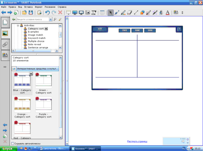 Начнем, (в качестве примера - очень подробно) с интерактивного средства Category sort (сортировщик). Чтобы использовать его, установим режим работы с коллекциями, откроем коллекцию Lesson Activity Toolkit, выберем в ней раздел Activities, а в этом разделе средство Category sort. В дальнейшем вместо длинного описания этой процедуры будем использовать запись: Lesson Activity Toolkit → Activities → Category sort. В результате произведенных манипуляций мы увидим следующую картинку: