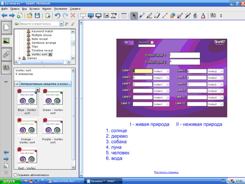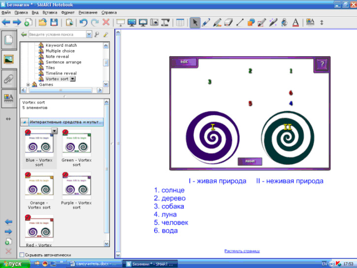 Рассмотрим пример. Разделим природу на живую и неживую. Перед началом редактирования можно приготовить коллекцию картинок, записать словами для вставки в "Водоворот". Так как русские буквы не вводятся, то предварительно нужно напечатать. Ниже на Рис.1 - процесс редактирования, на Рис. 2 - перед началом работы, на Рис 3 - итог работы.