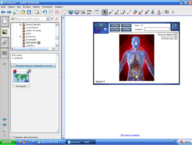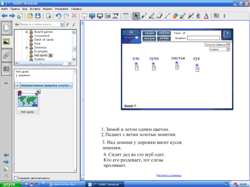 Название говорит само за себя. В процессе редактирования учитель может выставить на поле некоторое количество точек, сопроводив каждую каким-то текстовым "ярлычком". А во время работы ученики эти точки должен в конкретные места поля расставить, располагая только "ярлычками". Но смысл выставления точек в то или иное место зависит от того, что представляет из себя само поле. И вот здесь-то и кроется самое интересное! Т.к. варианты полей могут быть самыми различными. Понятно, что и текстовые ярлыки (подписи) к точкам будут зависеть от того, что представляет собою те или иные точки. Обидно, что такие замечательные возможности нельзя использовать полноценно. Ибо никакие текстовые подписи не могут содержать буквы русского алфавита. При попытке работать в русской раскладке средство их просто проигнорирует…