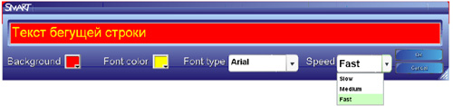 Название говорит само за себя. При редактировании вводим текст бегущей строки, выбираем шрифт, его цвет и цвет фона, одну из трех возможных скоростей "бега" текста. Все эти параметры задаются в уже хорошо известных Вам окнах: